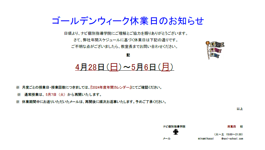 本日はGW休業についてご案内いたします。4月29日(金)~5月5日(木)上記の期間は休業日となります。通常授業再開は5/7(火)からとなります。