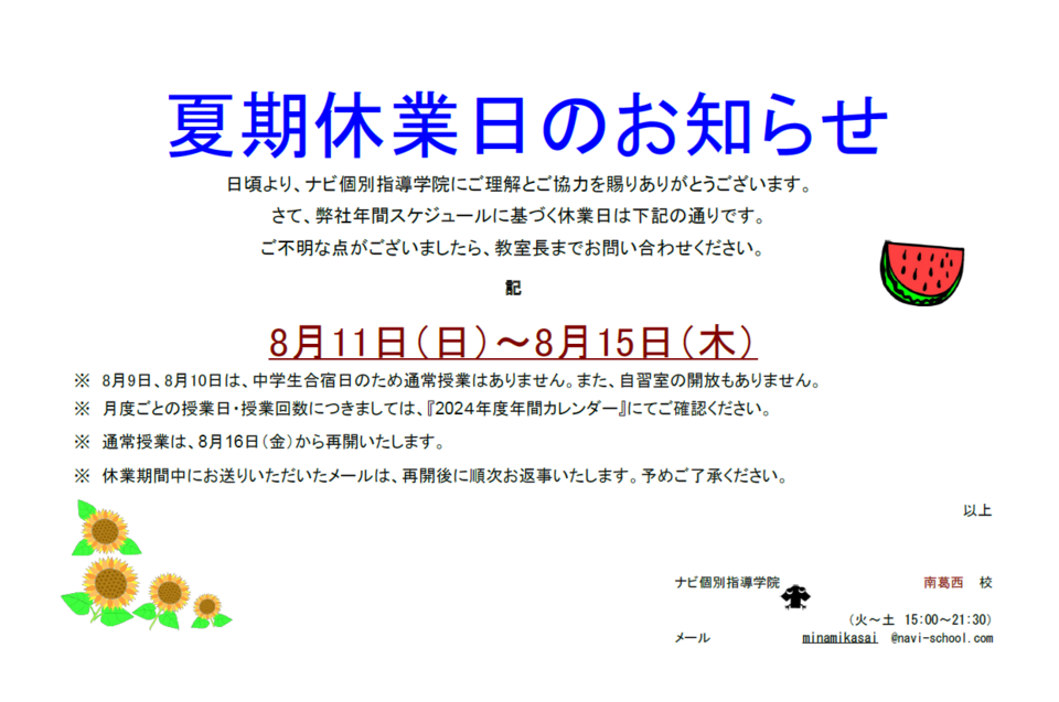 また、8月9日(金)、10日(土)は通常授業はございません。また自習室の利用もできません。