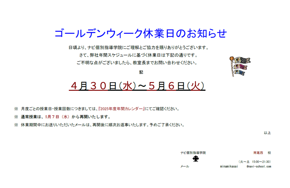 本日はGW休業についてご案内いたします。4月30日(水)~5月6日(火)上記の期間は休業日となります。通常授業再開は5/7(水)からとなります。