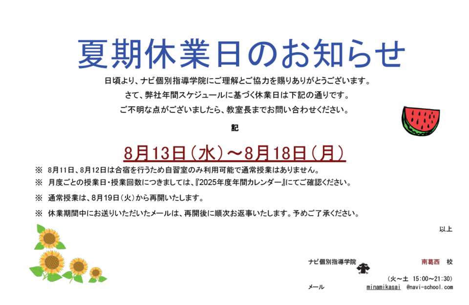 また、8月11日(月)~8月12日(火)は、夏期講習専用日となり、通常授業はございません。