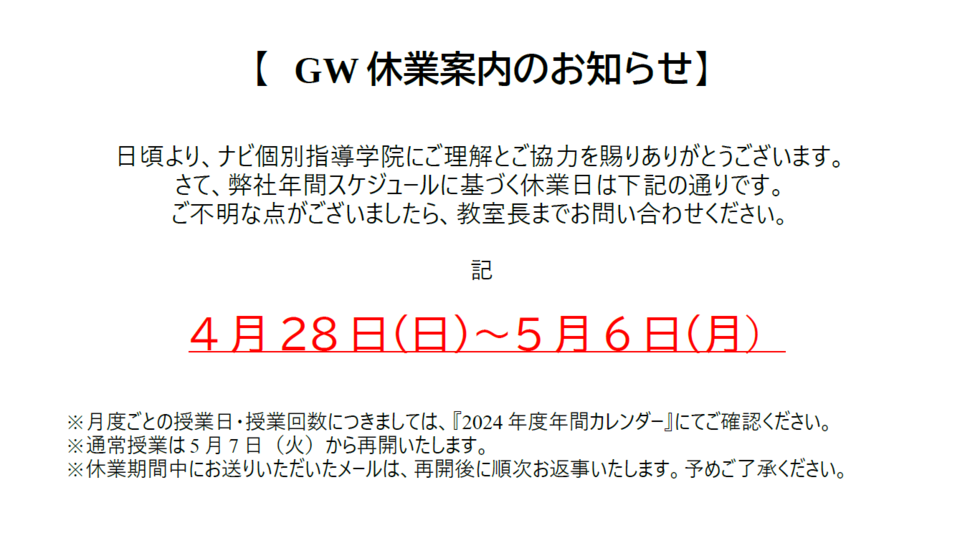本校の休業日のお知らせをさせていただきます。