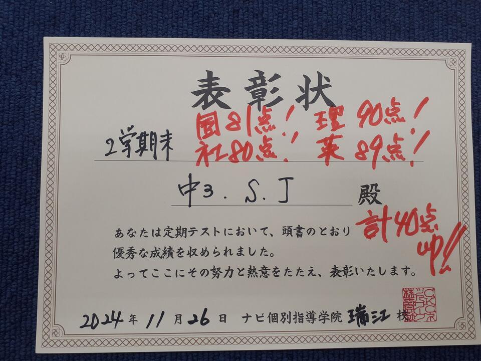 【頑張ったね!!】江戸川区のみなさん、こんにちは。ナビ個別学院瑞江校です。中3生はスピーキングテストも終わってラストスパートですね。S・J君 さすがの底力!!S・J君も自習室で頑張っていましたね。結果が出るかどうかはわかりませんが、結果が出た人は相応の取り組みをした人だということですよね。残り3か月。油断することなく取り組んでいきましょう!