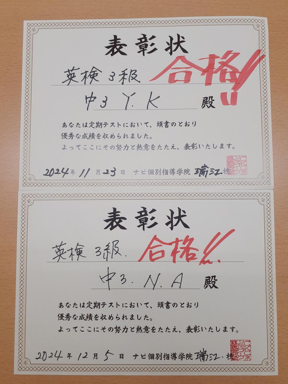 N・Aさん!Y・Kさん!英検3級合格おめでとう!!!