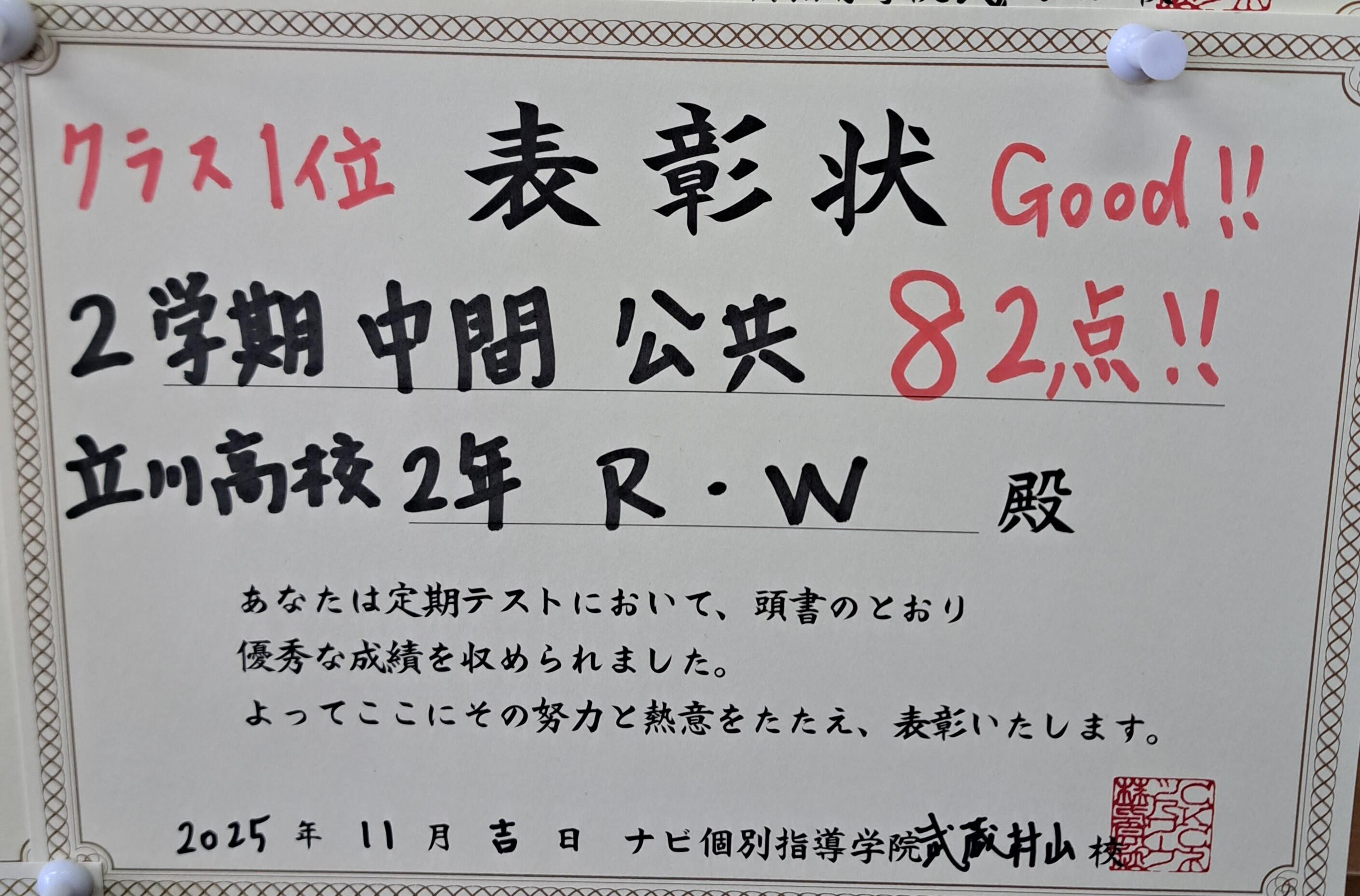 写真は中間テストの表彰状です。