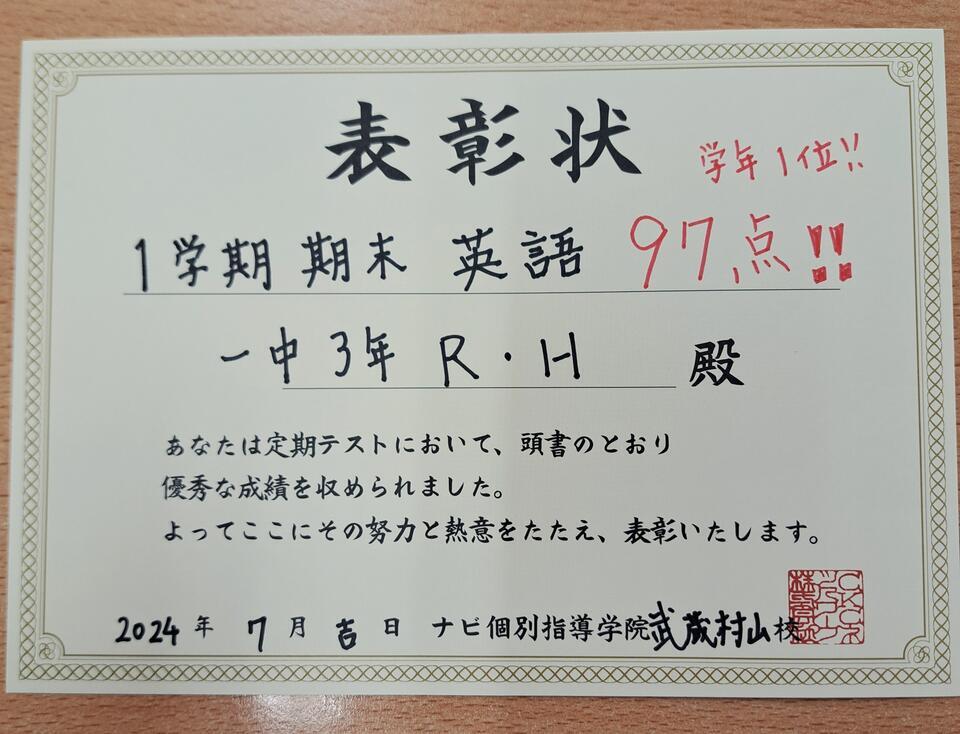 今回は英語のテストが学年1位だった生徒について紹介します。