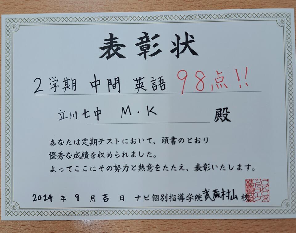 英語が前回の100点に続いて今回も高得点の98点。