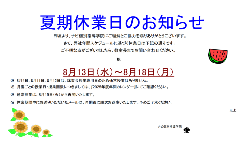日頃より、ナビ個別指導学院にご理解とご協力を賜りありがとうございます。