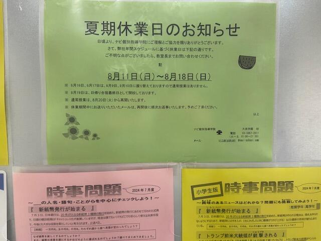 通常授業(オンライン授業含む)は8月10日(土)までとなります。