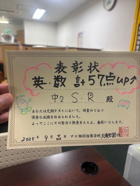 2学期中間が終了しました!早速成績UP事例が!!!!なんと英語数学合わせて57点UP!(^^)!おめでとう!自習室も活用して成績UP達成しました。