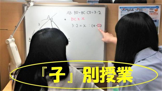 ナビ個別指導学院の授業は、個別の席ごとに設置された自分専用のホワイトボードで解き方や考え方を一緒に確認、それから生徒が問題を解くという「個別授業」スタイルです。