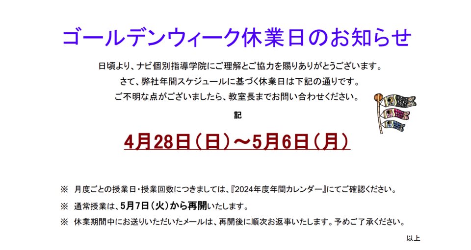 GW休業日 4月28日(日)~5月6日(月)