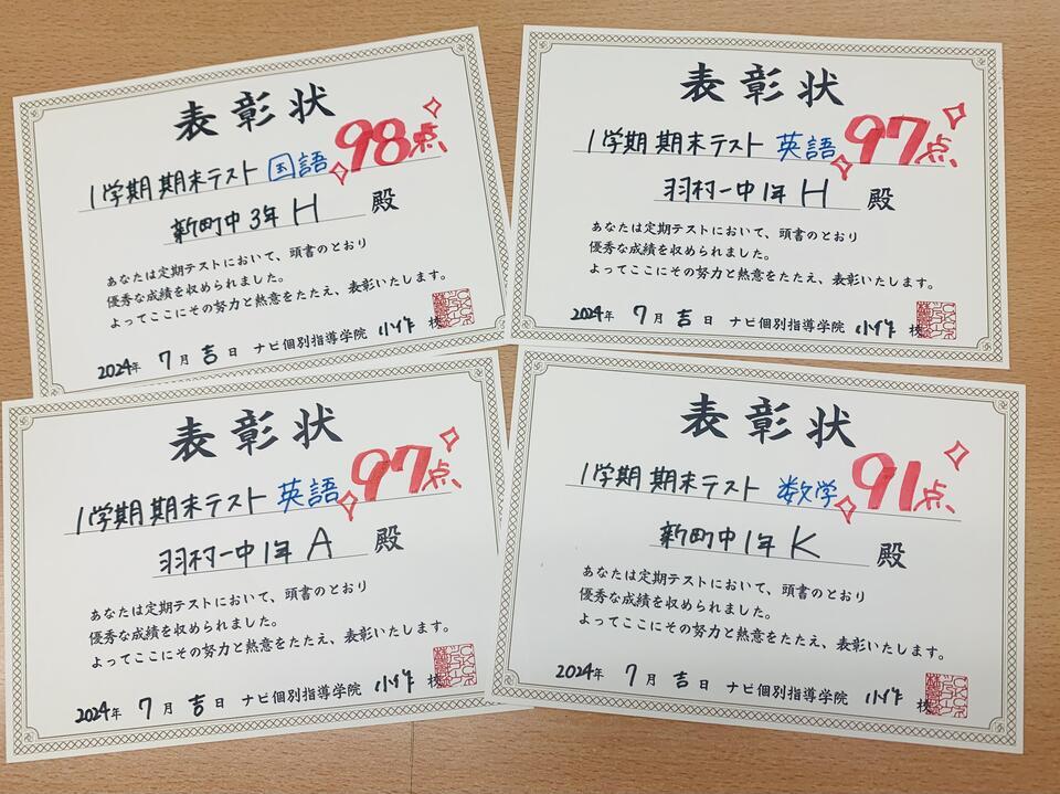 今回は、1学期期末テストで90点以上の優秀者を