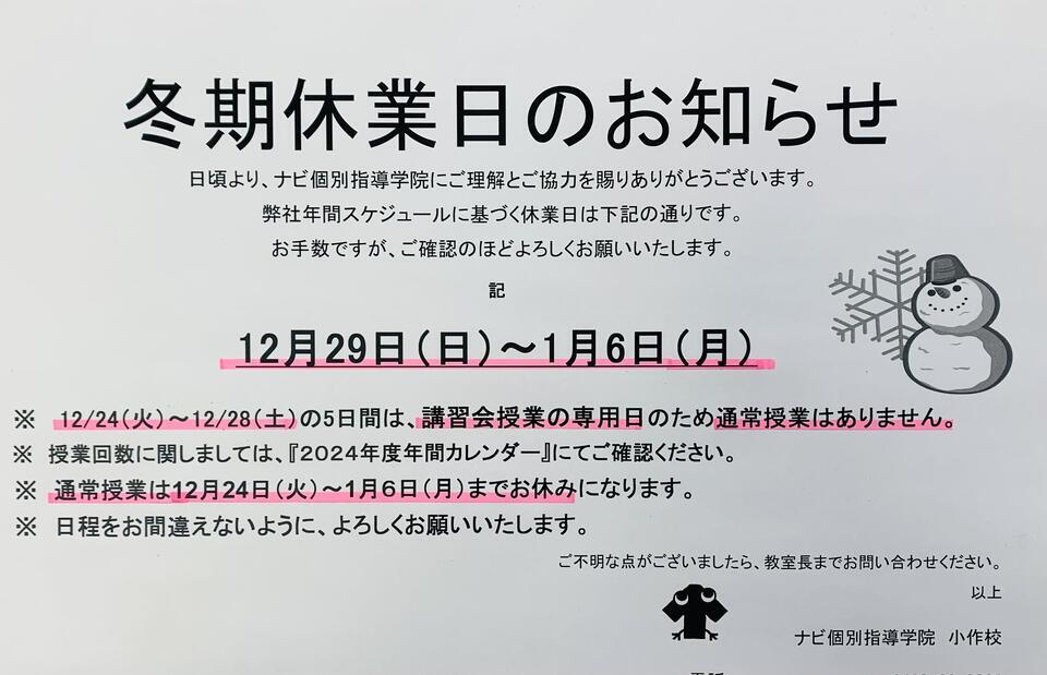 12月24日(火)~1月6日(月)まで、冬期休業となります。