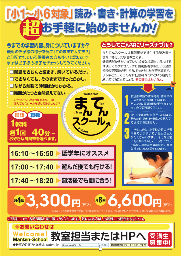 小学1~6年生を対象とした 「読み・書き・計算」の基礎学習に特化した授業です!