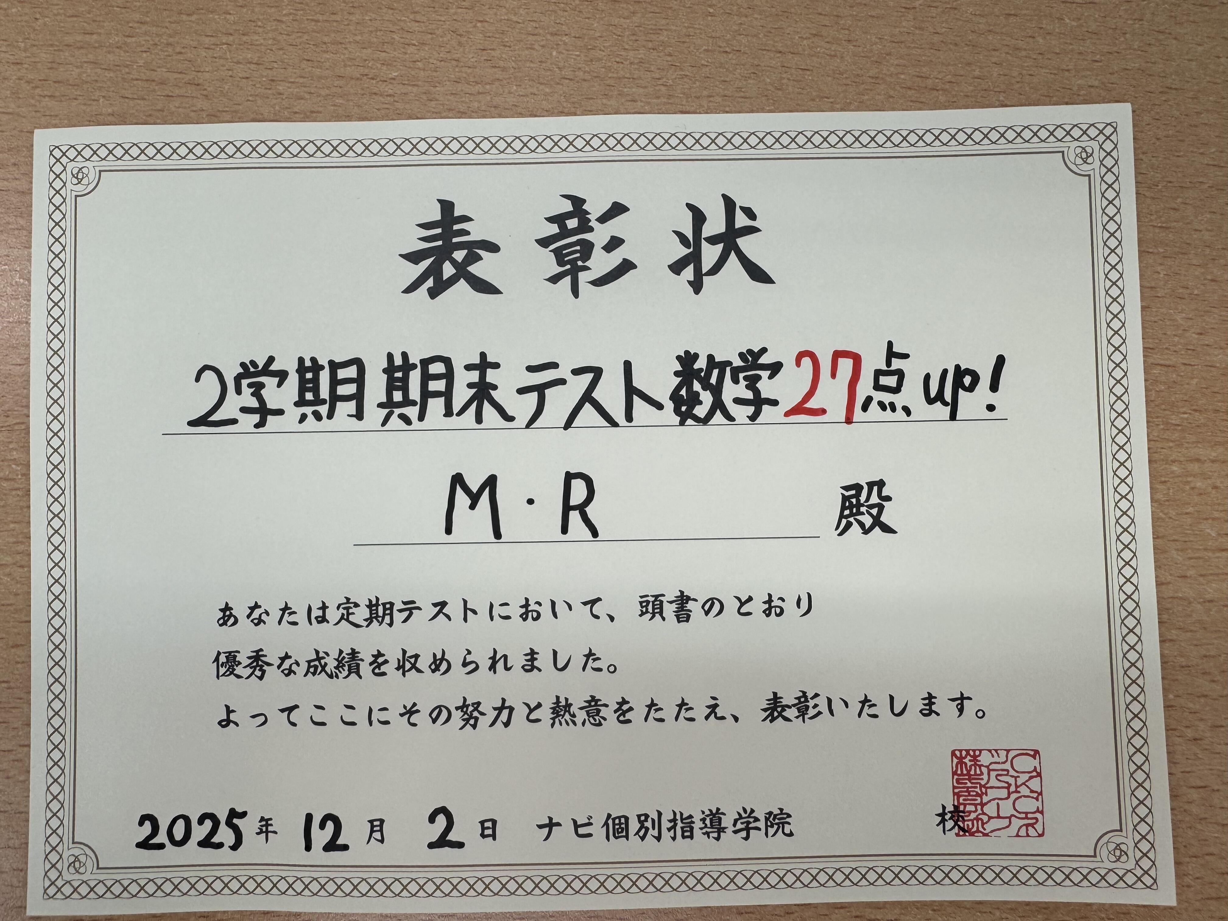 今回は2学期期末テストで点数アップした生徒の紹介です。