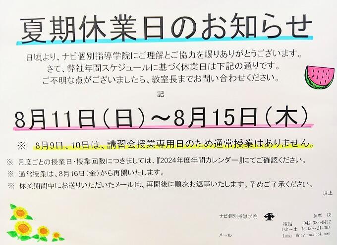 また、8月9日(金)・10日(土)は講習授業専用日のため