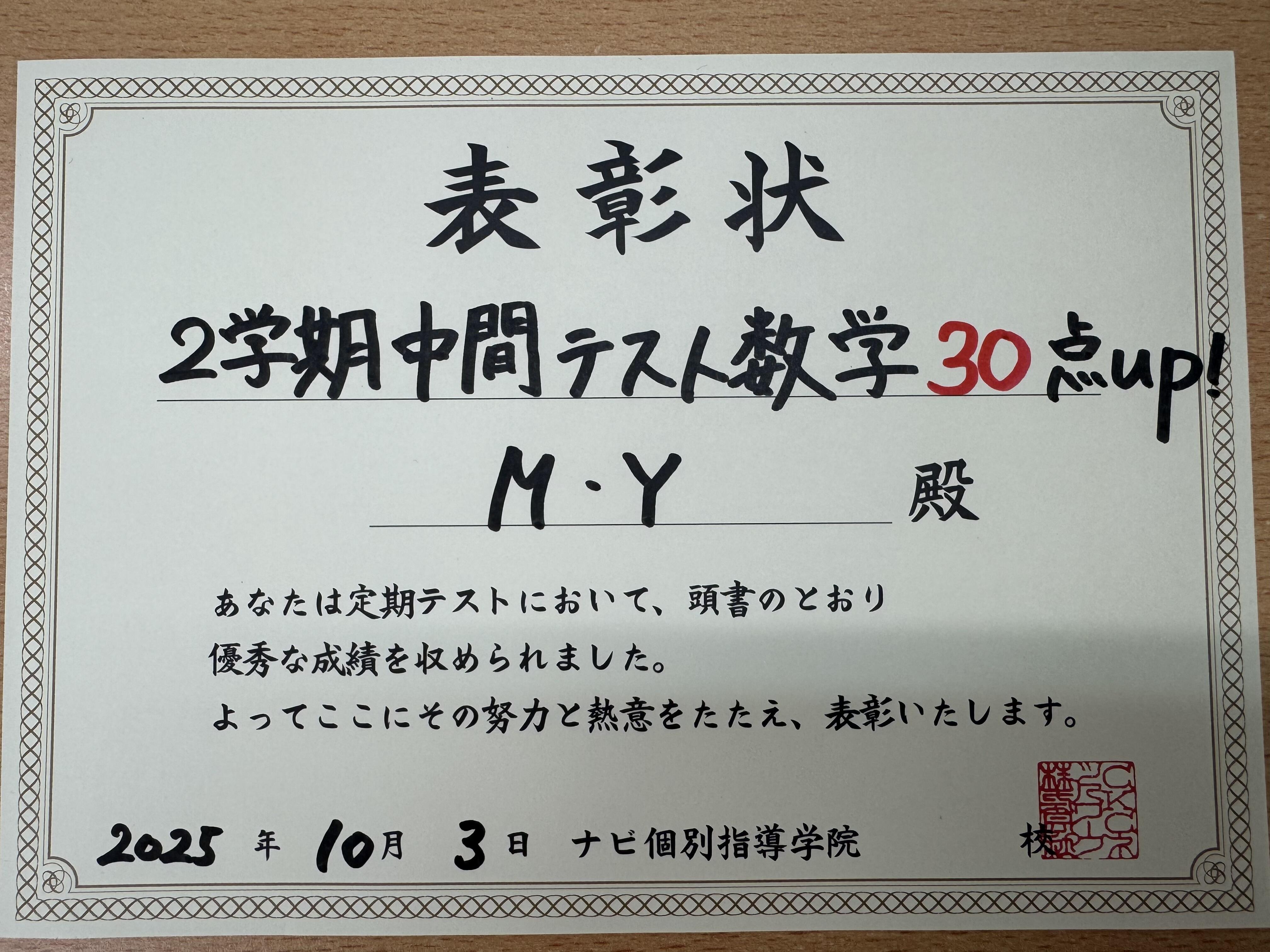 今回は2学期中間テストで点数アップした生徒の紹介です。