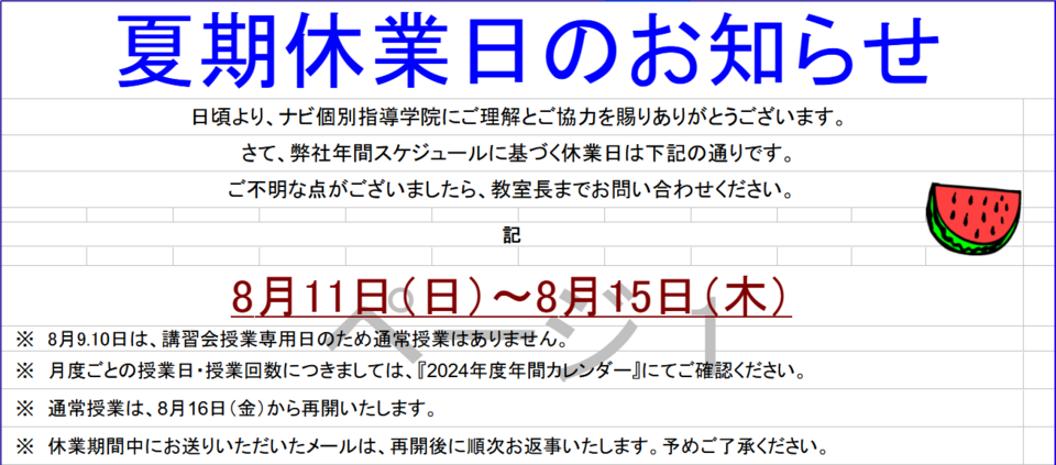 8/9~8/10 通常授業お休み