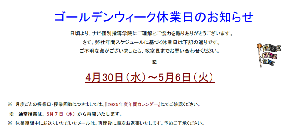 日頃より、ナビ個別指導学院にご理解とご協力を賜りありがとうございます。