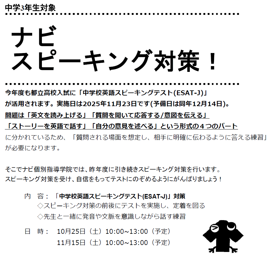 学校の授業でもなかなか扱っていない単元なので不安はあると思いますがナビでは「スピーキング」に関してもしっかりと対応させていただきます。