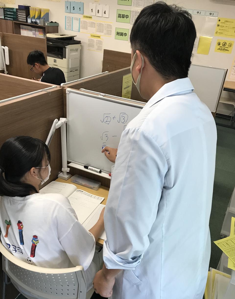 ナビ個別指導学院の授業は、個別の席ごとに設置された自分専用のホワイトボードで解き方や考え方を一緒に確認、それから生徒が問題を解くという「個別授業」スタイルです。