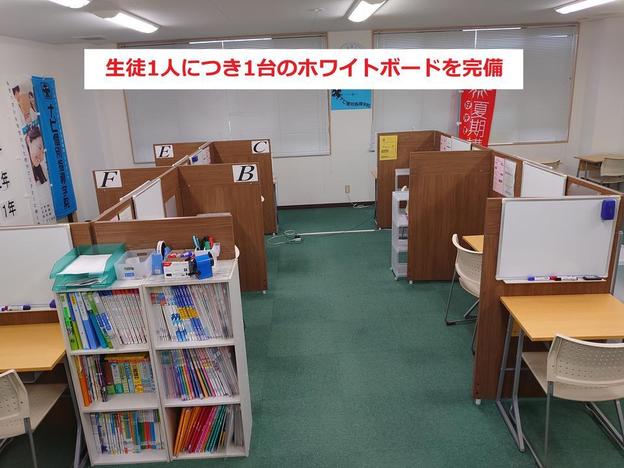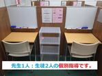 ナビ個別指導学院の授業は、個別の席ごとに設置された自分専用のホワイトボードで解き方や考え方を一緒に確認、それから生徒が問題を解くという「個別授業」スタイルです。