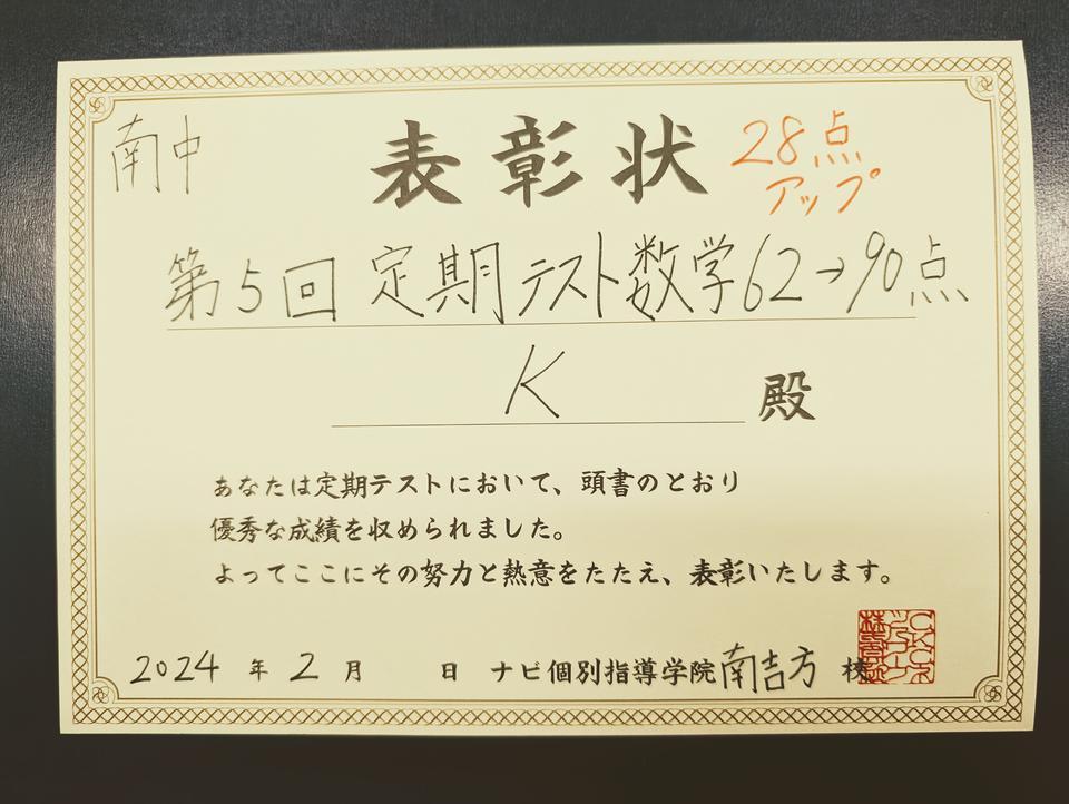 今回のテスト数学が62点から90点のアップです。