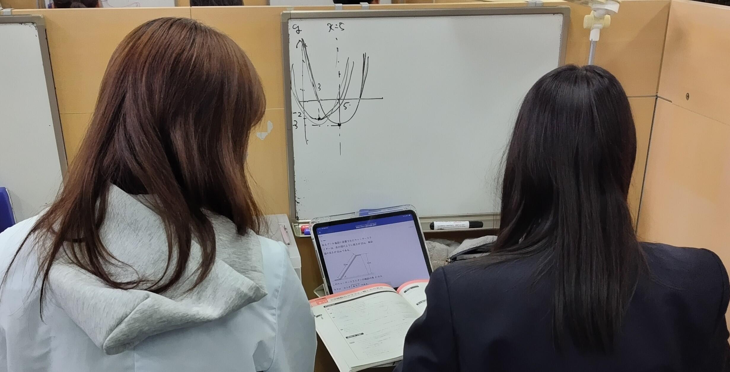 ナビ個別指導学院の授業は、個別の席ごとに設置された自分専用のホワイトボードで解き方や考え方を一緒に確認、それから生徒が問題を解くという「個別授業」スタイルです。