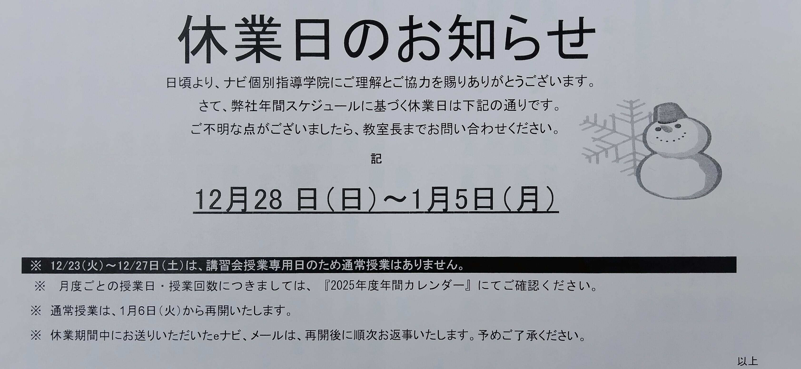 ナビ個別指導学院~校は12/28(日)~1/5(月)の間は冬期休業となっております。