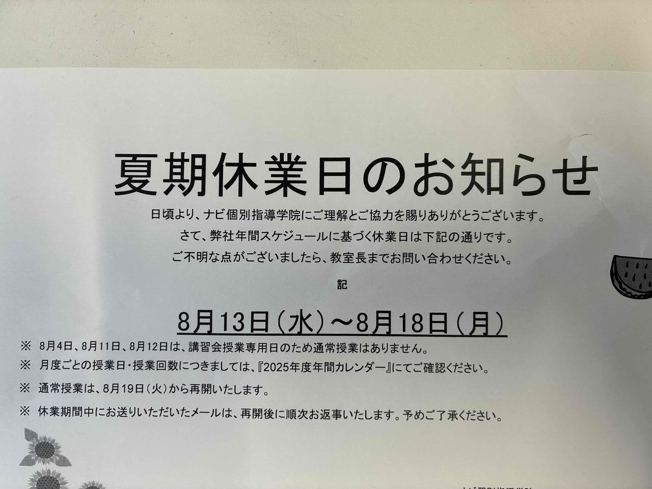 本日は、夏期休業のお知らせをさせていただきます。ナビ個別指導学院砺波校は 8/13(水)~8/18(月)まで夏期休業となっております。上記の間は教室がお休みの為、授業がなく、自習室も利用ができません。休業期間中にいただいたメール・お電話には、再開後に順次お返事させていただきます。
