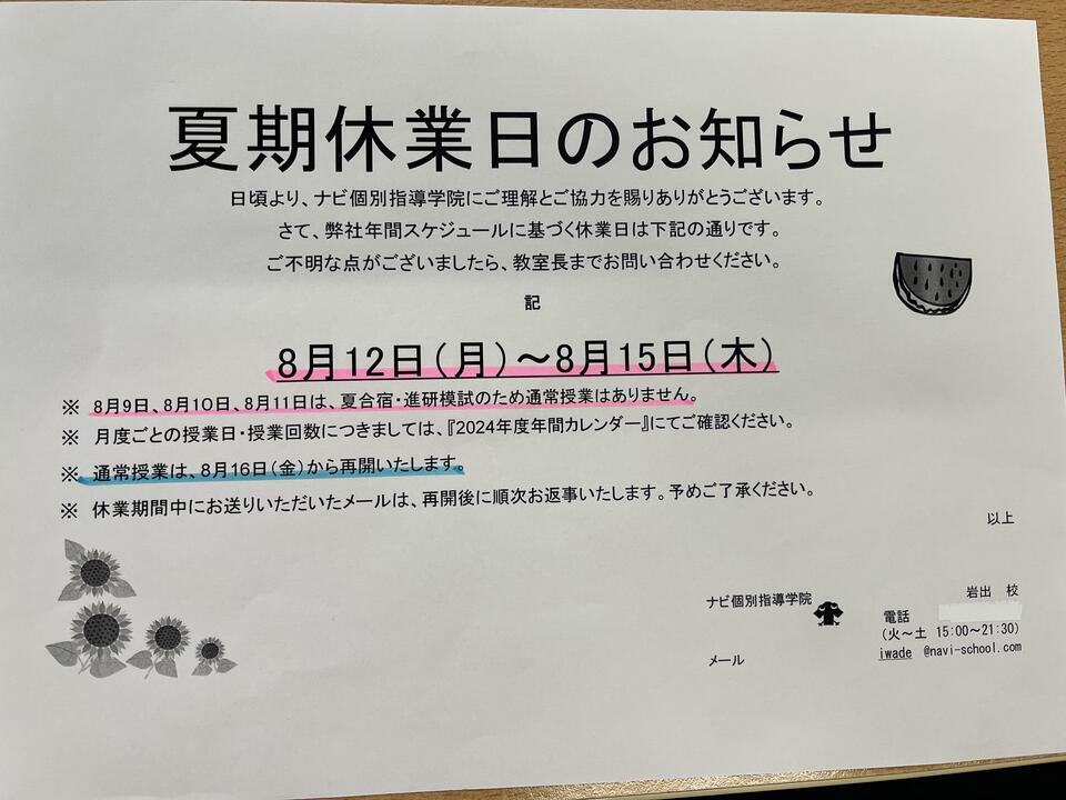 8/12(月)~8/15(木)は夏期休業期間で教室が閉まっています。