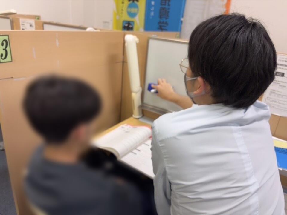 ナビ個別指導学院の授業は、個別の席ごとに設置された自分専用のホワイトボードで解き方や考え方を一緒に確認、それから生徒が問題を解くという「個別授業」スタイルです。