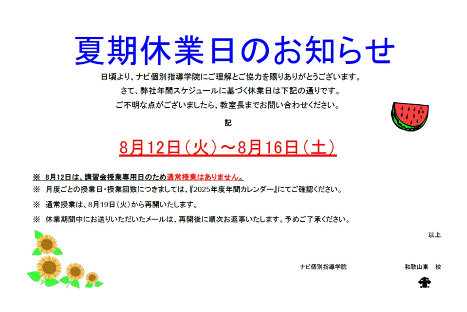 日頃より、ナビ個別指導学院にご理解とご協力を賜りありがとうございます。