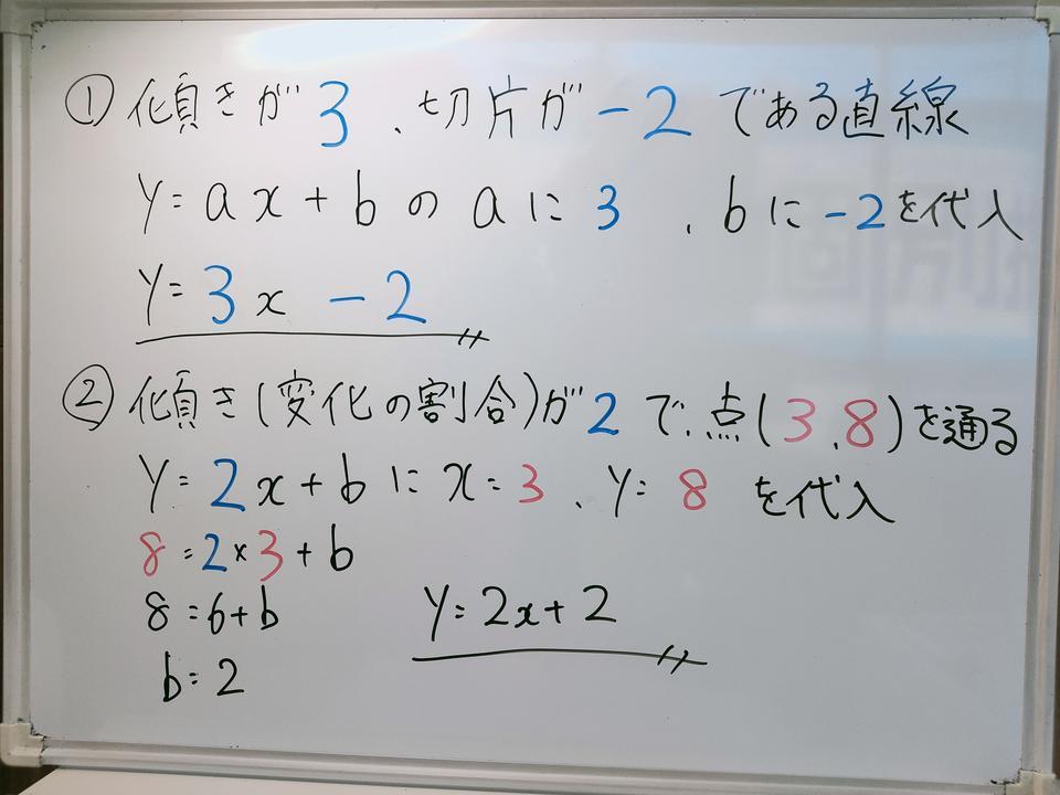そうするとbについての方程式ができるので、それを解けば一次関数の式を求めることができます。