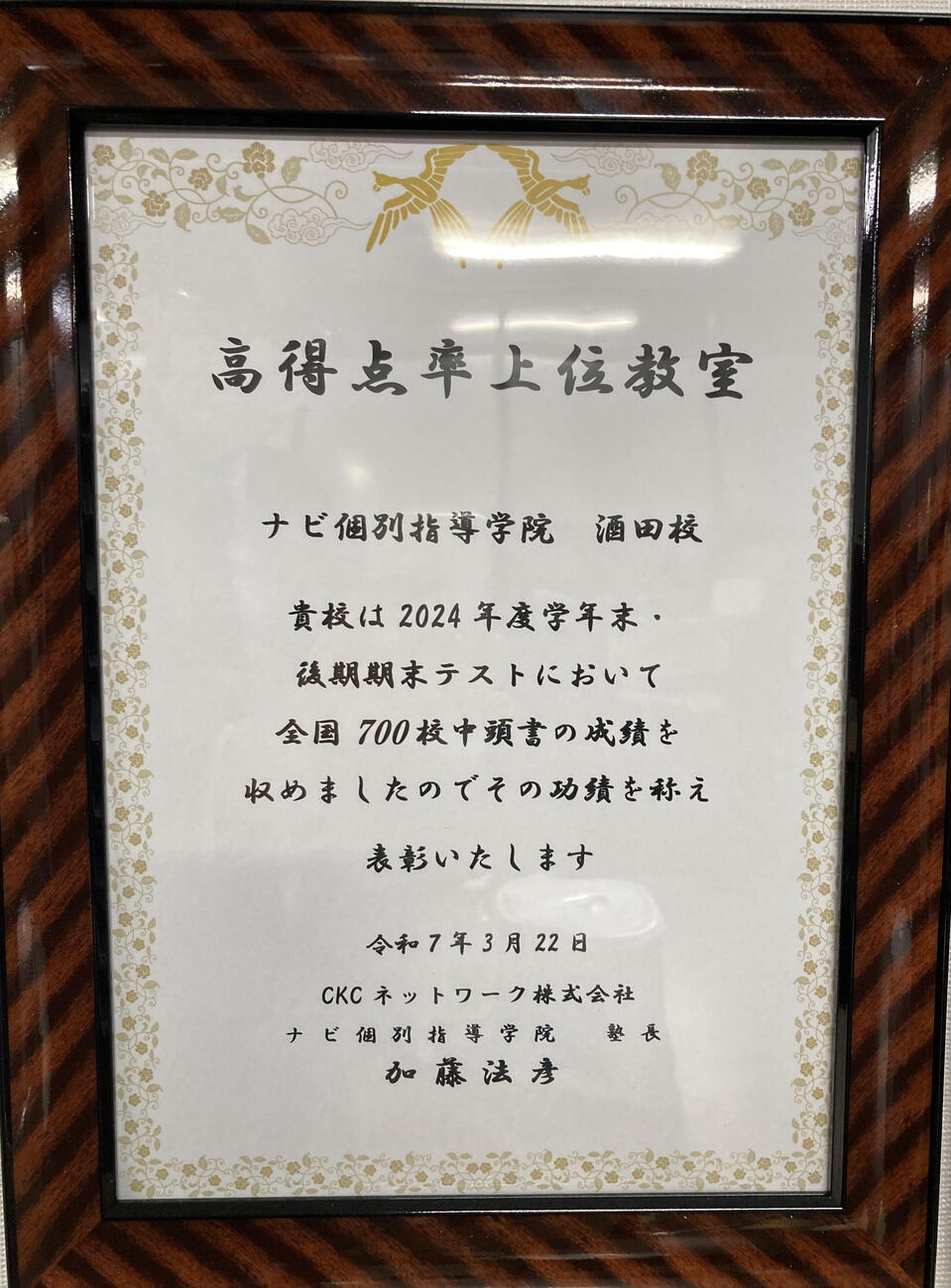 2024年度の学年末テスト結果において高得点者の多い教室として表彰されました!