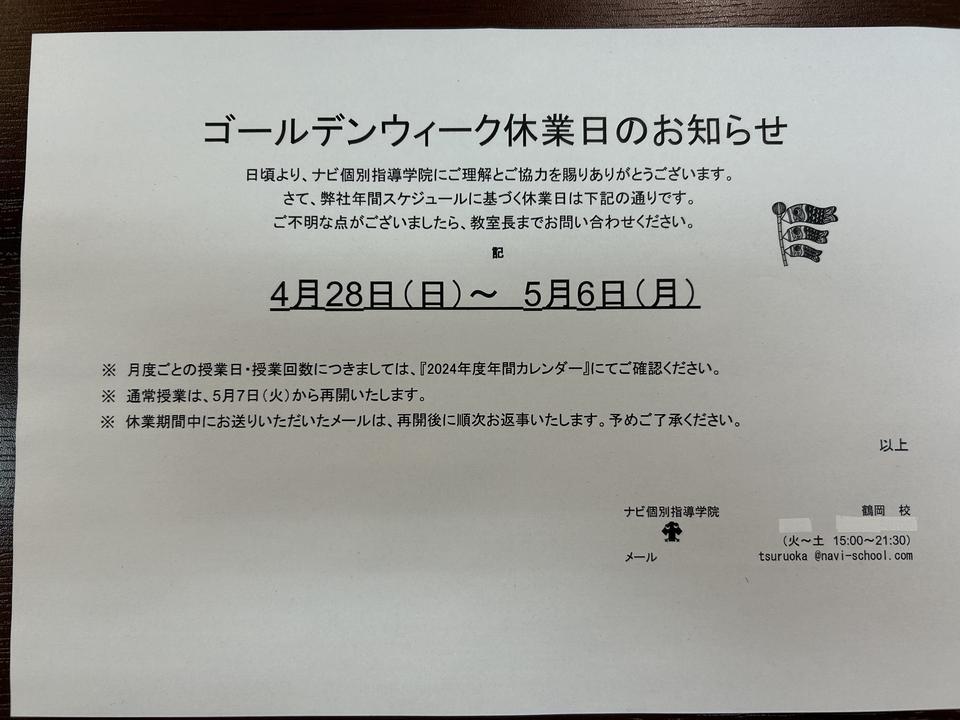 本日はゴールデンウィークによる休業日のお知らせをさせていただきます。