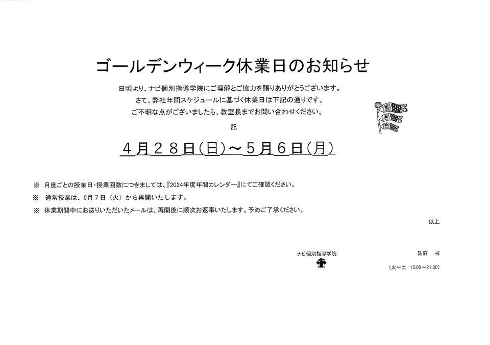 日頃より、ナビ個別指導学院にご理解とご協力を賜りありがとうございます。さて、弊社年間スケジュールに基づく休業日は下記の通りです。ゴールデンウィーク休業日 4月28日(日)~5月6日(月)※月度ごとの授業日・授業回数につきましては、『2024年度年間カレンダー』にてご確認ください。※休業期間中にお送りいただいたメールは、再開後に順次お返事いたします。予めご了承ください。