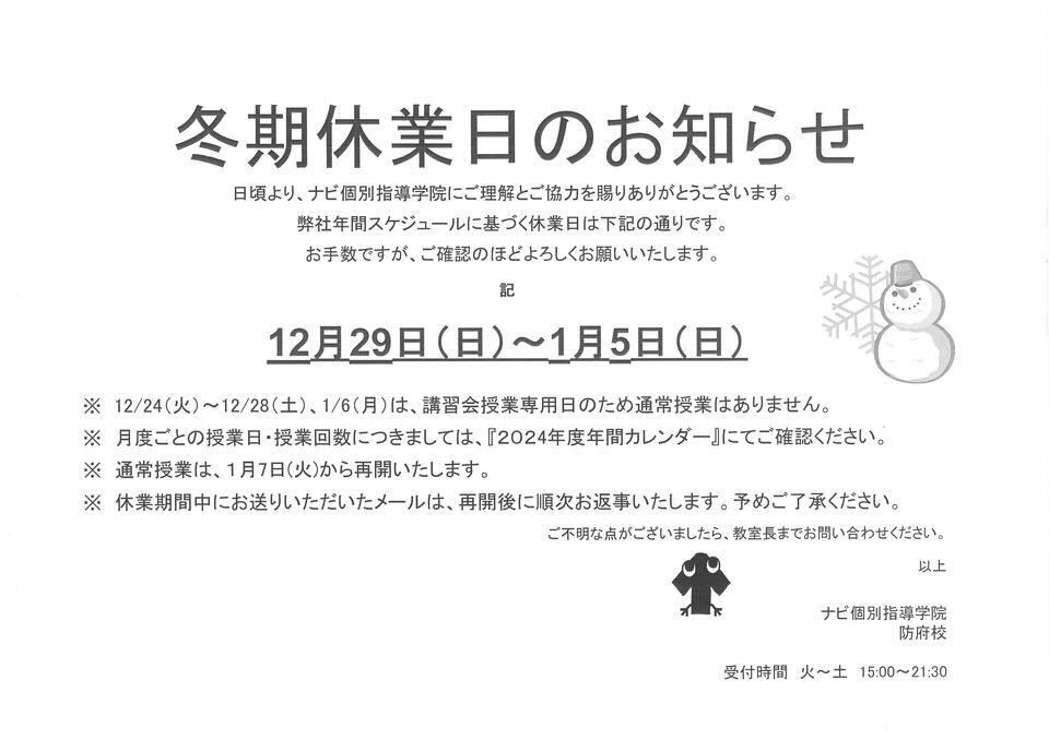 ※12/24(火)~12/28(土)、1/6(月)に関しましては、講習会専用日の為、通常授業はお休みです。