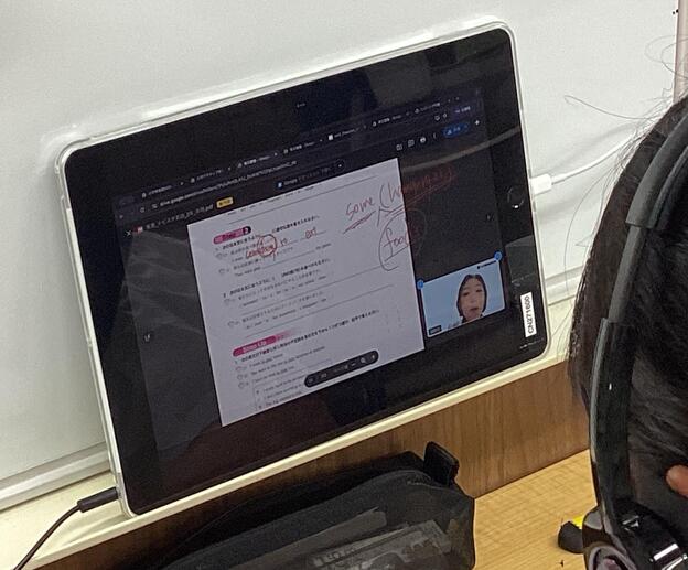 ナビ個別指導学院の教室で受けるオンライン授業は、Zoomを使って先生とつながり、個別の席ごとに設置されたタブレットを使って、解き方や考え方を一緒に確認。それから生徒が問題を解くという「個別授業」スタイルです。
