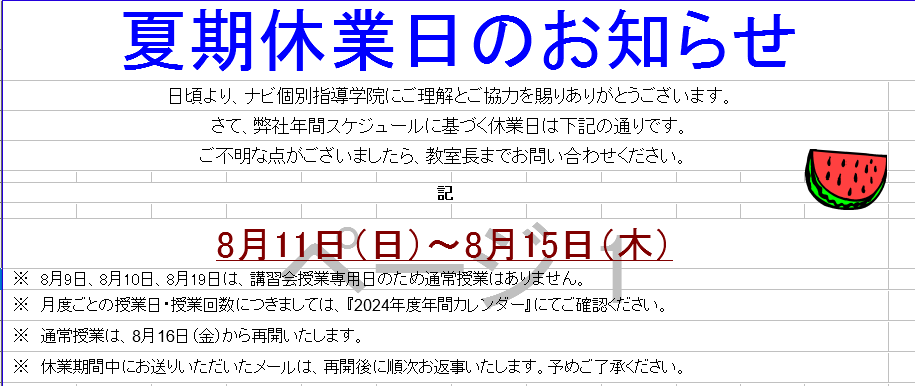 日頃より、ナビ個別指導学院にご理解とご協力を賜りありがとうございます。さて、弊社年間スケジュールに基づく休業日は下記の通りです。夏期休業日 8月11日(日)~8月15日(木)※月度ごとの授業日・授業回数につきましては、『2024年度年間カレンダー』にてご確認ください。※8/9(金)~8/10(土)に関しましては、講習会専用日の為、通常授業はお休みです。※休業期間中にお送りいただいたメールは、再開後に順次お返事いたします。予めご了承ください。