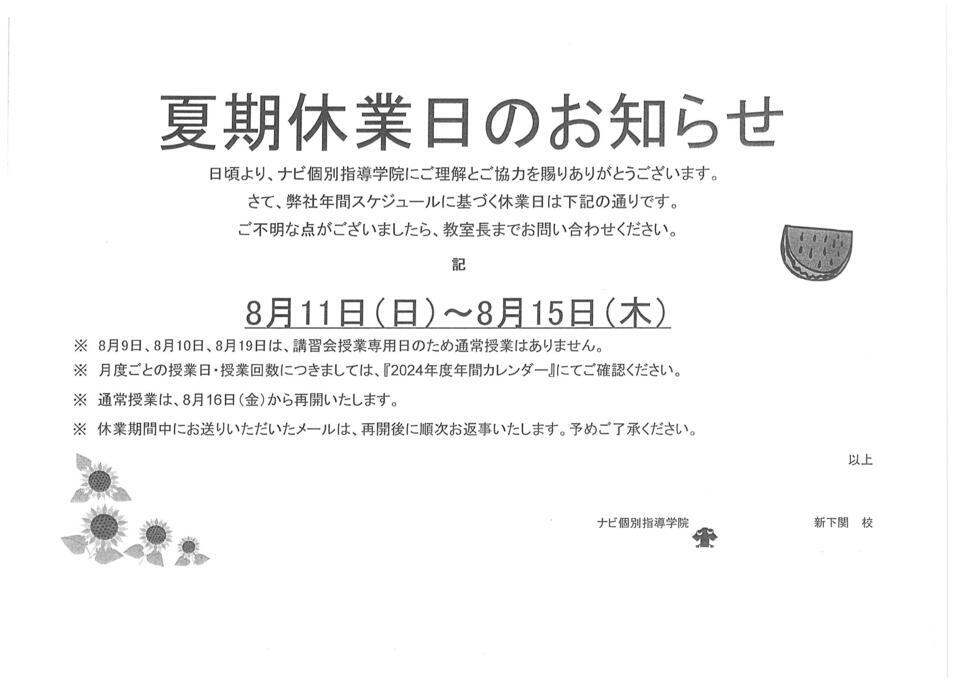 夏期休業日 8月11日(日)~8月15日(木)