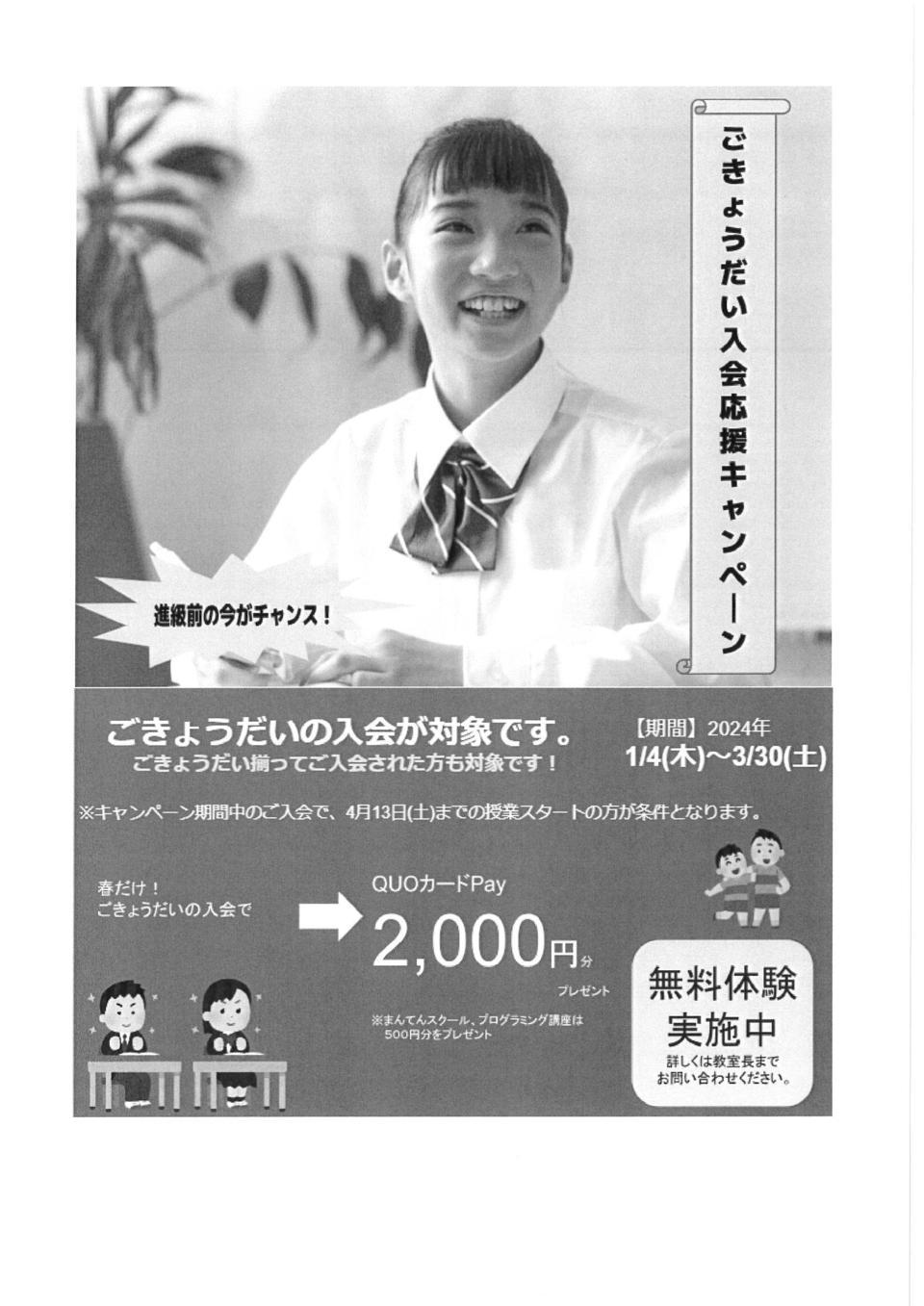 2024年1月4日(木)~3月30日(土)までに入会すると、QUOカードPay2000円分をプレゼントします!(ただし、4月13日(土)までの授業スタートが条件となります。)