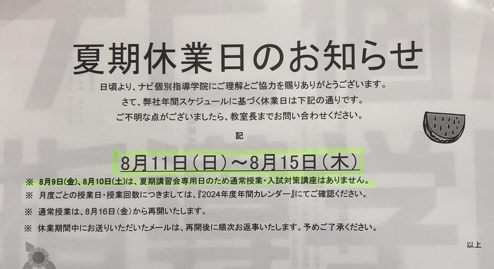 日頃より、ナビ個別指導学院にご理解とご協力を賜りありがとうございます。さて、弊社年間スケジュールに基づく休業日は下記の通りです。夏期休業日 8月11日(日)~8月15日(木)※月度ごとの授業日・授業回数につきましては、『2024年度年間カレンダー』にてご確認ください。※8/9(金)~8/10(土)に関しましては、講習会専用日の為、通常授業・入試対策講座はお休みです。※休業期間中にお送りいただいたメールは、再開後に順次お返事いたします。予めご了承ください。