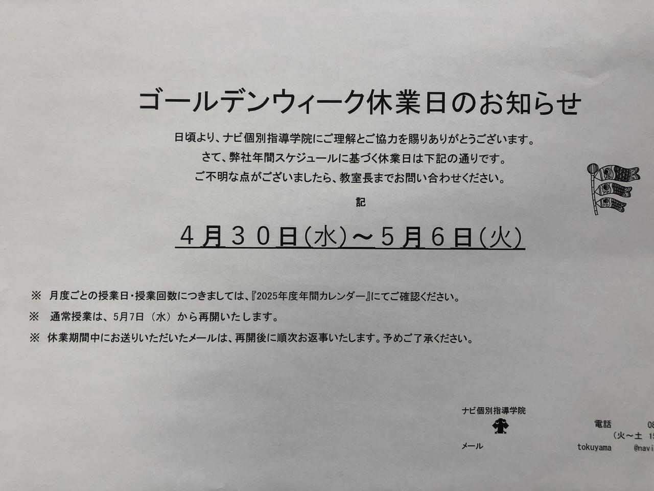 日頃より、ナビ個別指導学院にご理解とご協力を賜りありがとうございます。