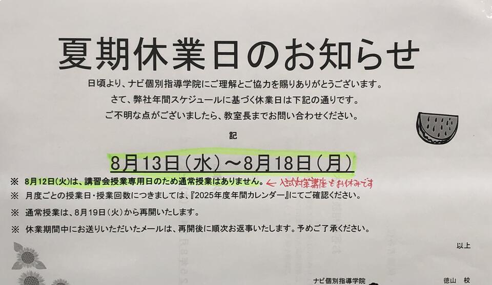 ※8月12日(火)は、講習会専用日となりますので、通常授業・入試対策講座はお休みです。振替授業や体験授業は受講いただけます。
