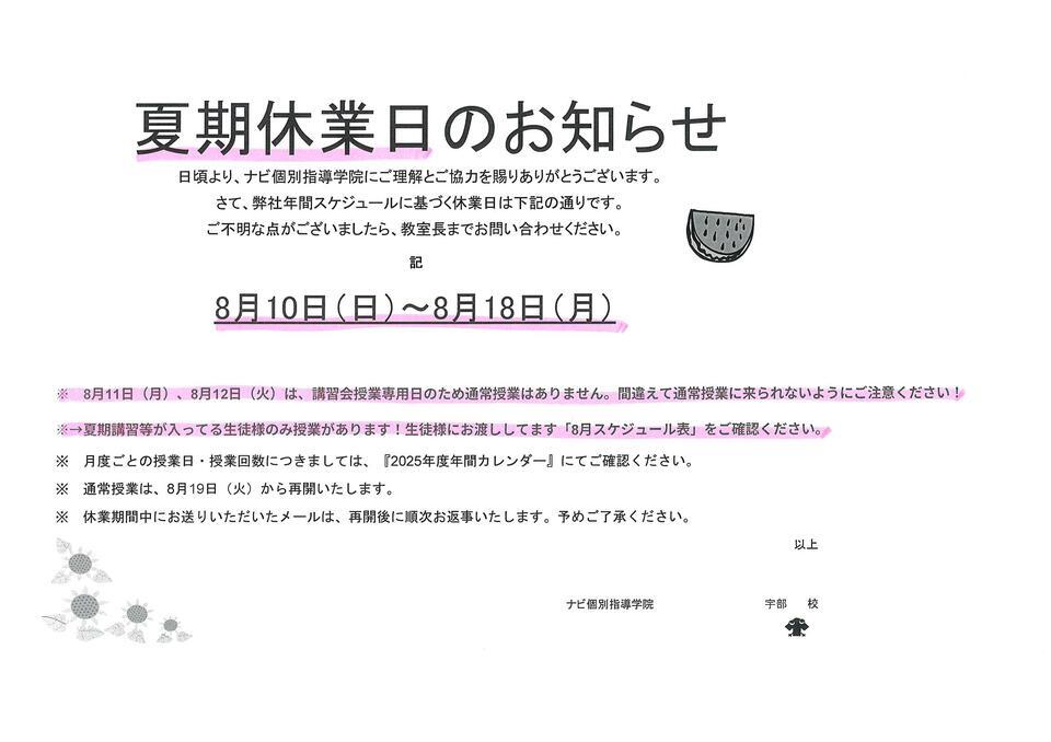 ※8月11日(月)と8月12日(火)は通常授業はございませんが、夏期講習会