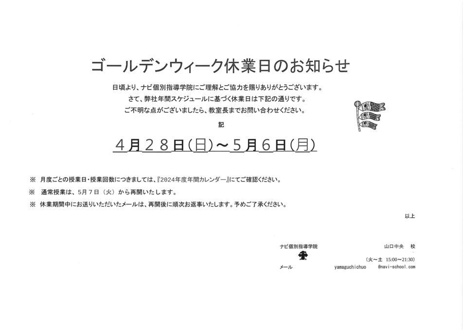 ゴールデンウィーク休業日 4月28日(日)~5月6日(月)