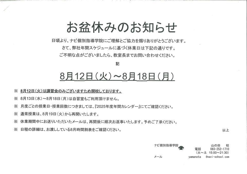※8月12日(火)は通常授業はございませんが、体験授業はございます。※上記日程に頂いたお申込みやお問い合わせは、8月19日(火)より順次対応いたします。 予めご了承ください。