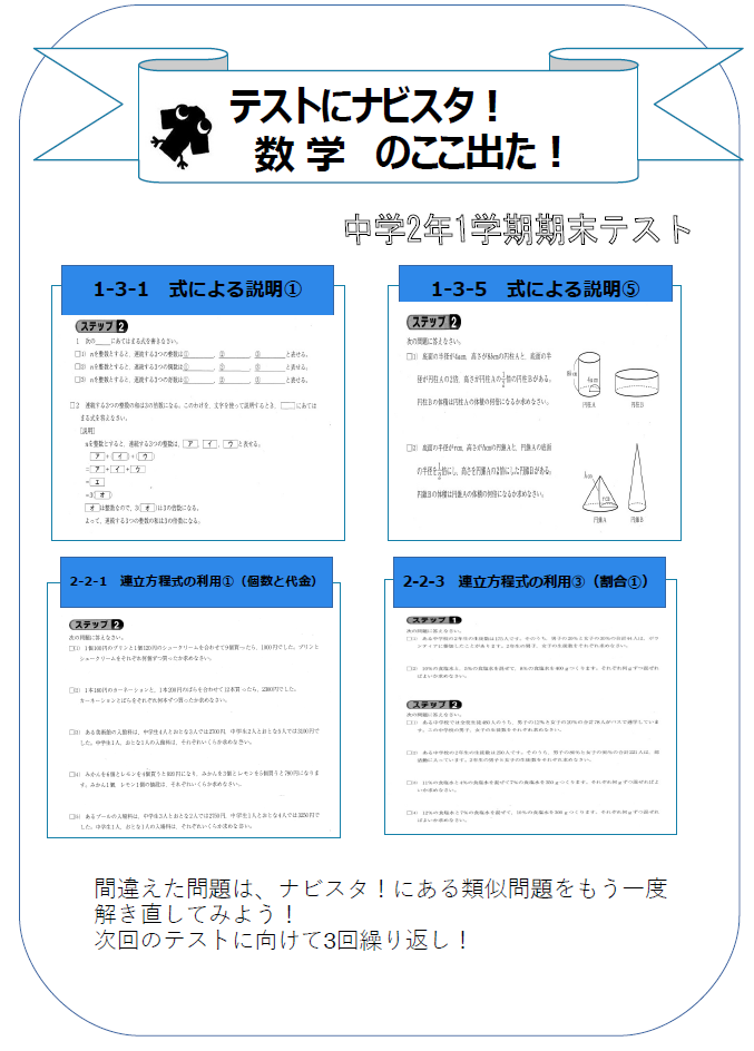 1学期の期末テスト、ナビ個別の自社教材「ナビスタ!」と近隣中学校のテストの