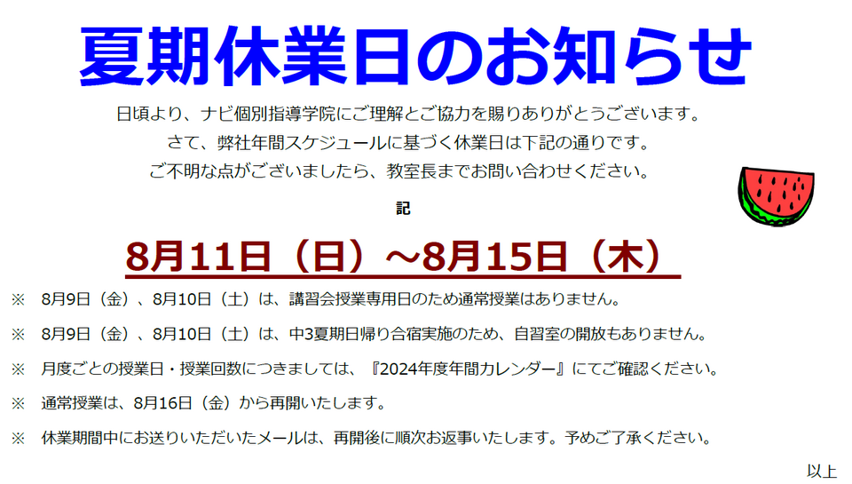 さて、ナビ個別指導学院富士吉田校では下記の通り、お休みを頂戴します。
